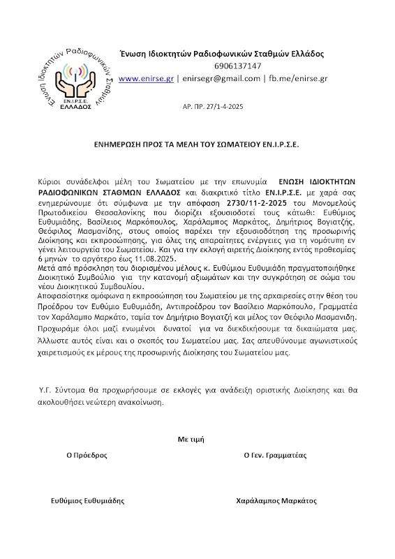 ΕΝΗΜΕΡΩΣΗ ΜΕΛΩΝ ( ΕΝ.Ι.Ρ.Σ.Ε ) ΕΝΩΣΗ ΙΔΙΟΚΤΗΤΩΝ ΡΑΔΙΟΦΩΝΙΚΩΝ ΣΤΑΘΜΩΝ ΕΛΛΑΔΟΣ ! AMFISSA NEWZ Πέμπτη, Απριλίου 03, 2025 AMFISSA NEWZ ΕΝΗΜΕΡΩΣΗ ΜΕΛΩΝ ( ΕΝ.Ι.Ρ.Σ.Ε ) ΕΝΩΣΗ ΙΔΙΟΚΤΗΤΩΝ ΡΑΔΙΟΦΩΝΙΚΩΝ ΣΤΑΘΜΩΝ ΕΛΛΑΔΟΣ !ΕΚ ΜΕΡΟΥΣ ΤΟΥ ΣΩΜΑΤΕΙΟΥ Ο ΓΕΝΙΚΟΣ ΓΡΑΜΜΑΤΕΑΣ ΧΑΡΗΣ ΜΑΡΚΑΤΟΣ Χάρης Μαρκάτος Tweet Share Share